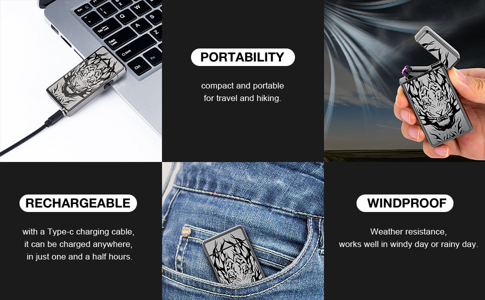 - 🐯【Windproof Flameless Lighter】USB lighter with windproof plasma technology means weatherproof, works well in rainy and windy days, and prevents accidental forest fires, great for camping, travel and hiking.